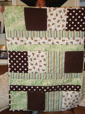 No not, the little monkey, er, I mean helper holding the blanket...but the fabric! The green is a really cute, yet suddle jungle print. And yes, that is more of the brown polka dot, I swear it is in every blanket I make...but I love it! But the best part is the three extra soft squares of cuddle chenille fabric...love that stuff!!